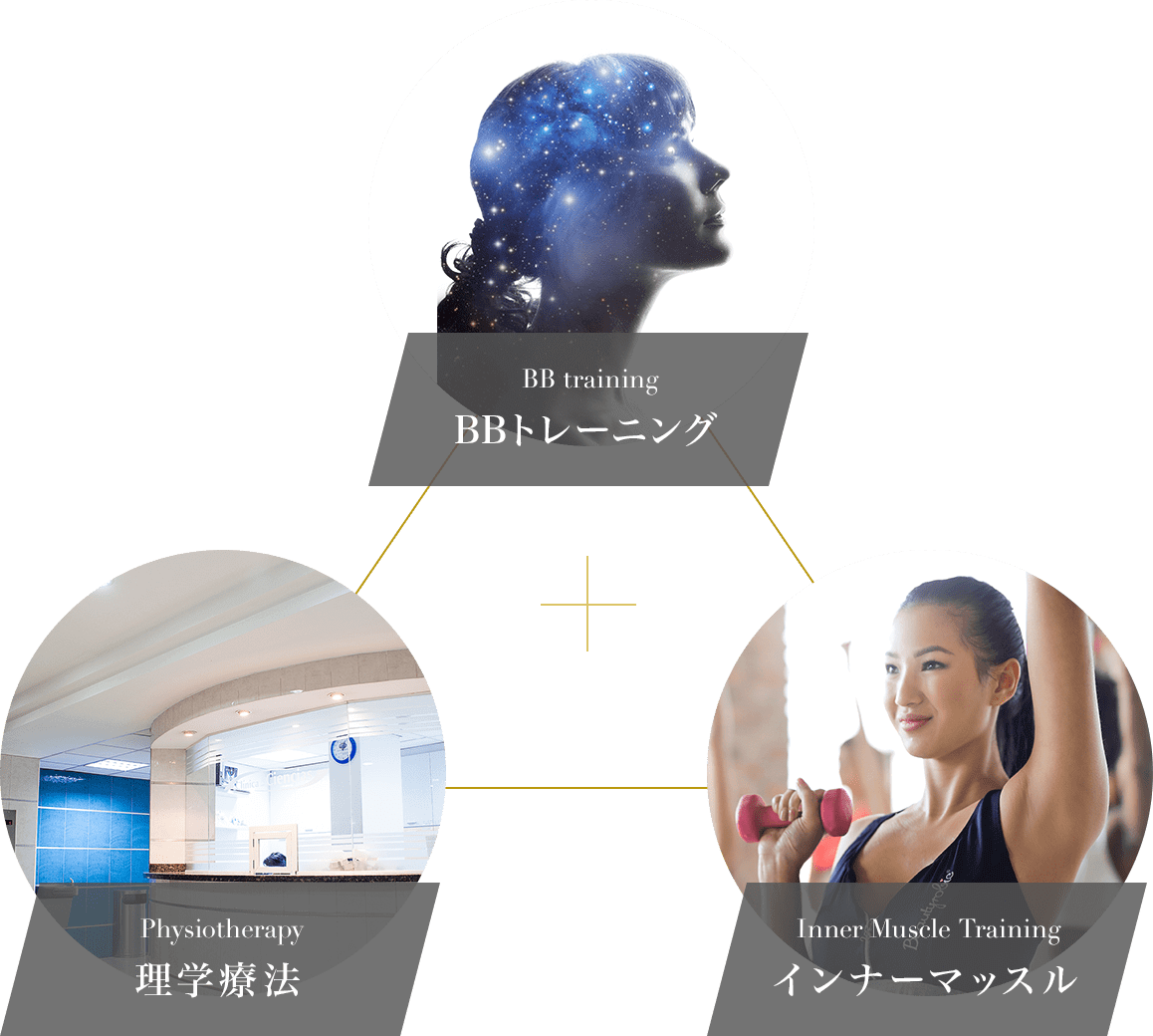 くびれ美人のパーソナルトレーニングは、B.Bトレーニング、理学療法、インナーマッスルトレーニングのトライアングルによるHATAメソッドから成り立ちます。