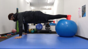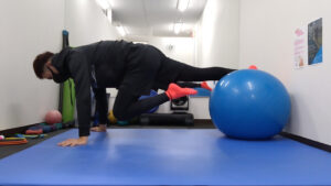 両足をバランスボールに乗せ、体幹部が落ちて腰が反らないようにキープしたり、マウンテンクライマーのように足を引き寄せたりするトレーニングです。