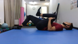 次に仰向けに寝転がり、太ももをお腹に引き寄せたところで、膝の曲げ伸ばしを行います。