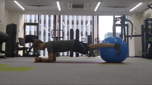 両足首でバランスボールを挟み、プランク姿勢をキープしています。