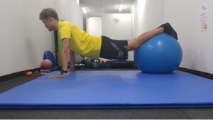 両手を地面に真っ直ぐ付き、両足のスネの部分をバランスボールに乗せます。