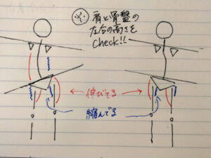 左側の絵では、右肩が下がり、右の骨盤が上がることで、右のわき腹が縮んでいることが分かります。