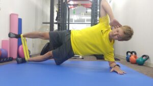 大腿骨外転動作で、中殿筋をメインターゲットに鍛えるトレーニングですが、チューブを巻く位置が変わるだけで、ターゲットの中殿筋ではなく、外もも等を使ってしまいます。