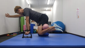 片膝をバランスディスクの上に乗せ、四つん這いの姿勢となり、同側の手をまっすぐと伸ばします。